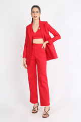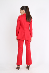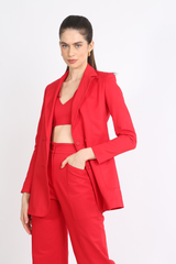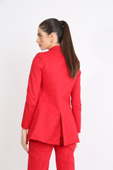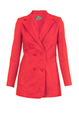 Blazer com modelagem acinturada, fechamento por botões e comprimento alongado.