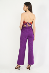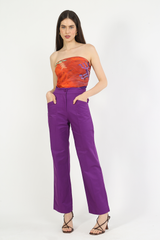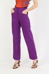 Calça modelagem reta, cintura alta, bolsos frontais, elástico no cós traseiro e fechamento por botão e zíper.