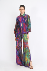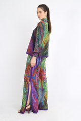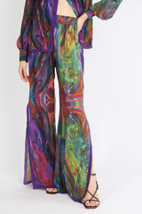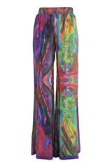 Calça confeccionada em crepe de seda com cós de elástico, modelagem pantalona e fenda nas laterais.