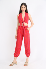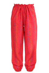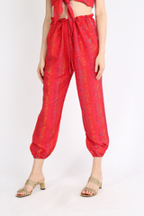 Calça cintura alta, ajuste na cintura com rolotê, elástico no tornozelo.