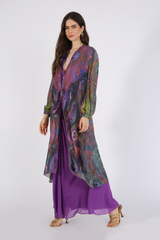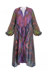 Capa de manga longa com elástico no punho, feita em tecido misto de modal com seda, possui uma faixa embutida para amarração.