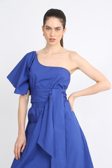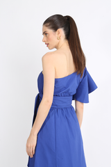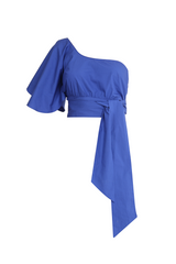 Cropped um ombro só, com manga levemente volumosa e faixa embutida para amarração na cintura, fechamento lateral com zíper.