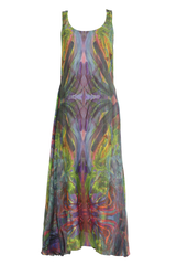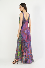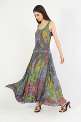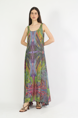 Vestido longo sem mangas, confeccionado em tecido misto de modal com seda, possui nesgas nas laterais que dão à peça um movimento maior, costas um pouco decotadas e com fechamento por zíper.