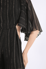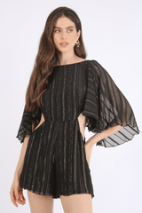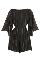 Macaquinho com mangas amplas, decote canoa, possui abertura lateral na altura da cintura, fechamento nas costas com zíper.