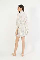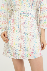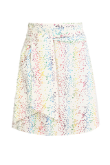 Saia modelagem parêo, comprimento curto, confeccionada em linho com foil.