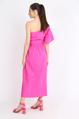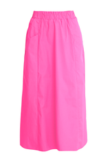 Saia reta, comprimento midi, com cintura de elástico ziguezague, e possui dois bolsos laterais com recortes.