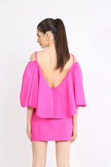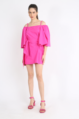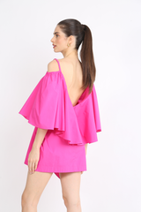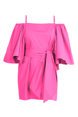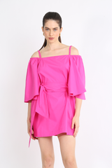 Vestido curto com mangas super amplas, alça fina com elástico franzido e possui uma faixa solta para amarração na cintura. Costas abertas, com fechamento em zíper.