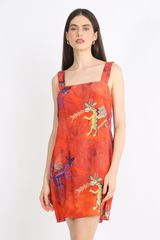 Vestido curto com alças médias, decote reto, modelagem reta com leve movimento e fechamento nas costas com zíper.