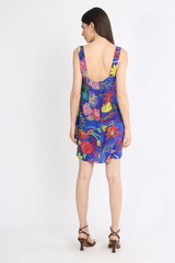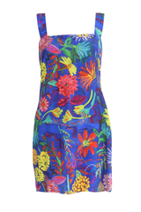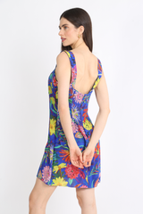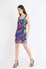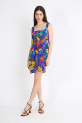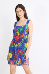 Vestido curto com alças médias, decote reto, modelagem reta com leve movimento e fechamento nas costas com zíper.