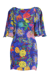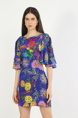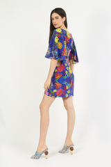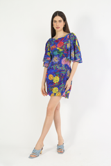 Vestido curto com mangas amplas, decote canoa, possui abertura lateral na altura da cintura, fechamento nas costas com zíper.