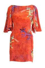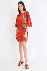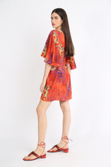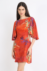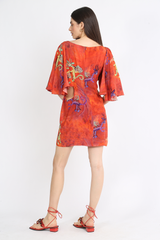 Vestido curto com mangas amplas, decote canoa, possui abertura lateral na altura da cintura, fechamento nas costas com zíper.