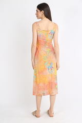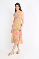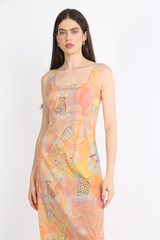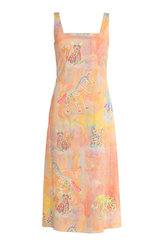 Vestido confeccionado no modal estampado, modelagem evasê, alças largas, acinturado e decote quadrado.