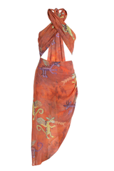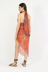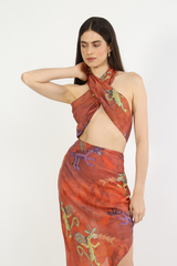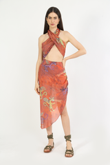 Vestido Midi, possui duas faixas para amarração no busto, saia assimétrica com leve drapeado na região esquerda.