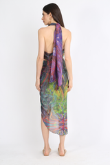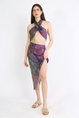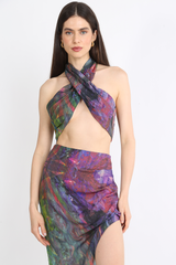 Vestido Midi, possui duas faixas para amarração no busto, saia assimétrica com leve drapeado na região esquerda.