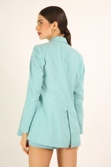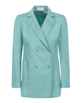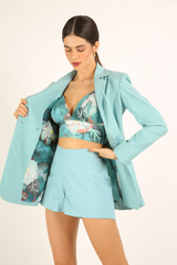 Blazer confeccionado em tecido misto de algodão, fechamento por botões reciclados, comprimento alongado, forrado em tecido de crepe de seda na estampa Camélia Verde