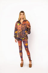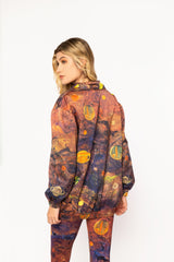 Jaqueta estampada modelo bomber com mangas longas e punhos em elástico. Shape amplo e fechamento frontal com zíper.
