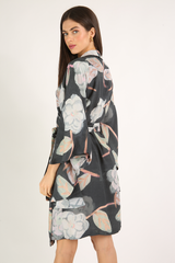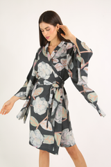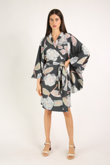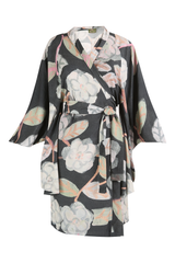 Kimono confeccionado em modal estampado, com mangas amplas e faixas para ajustes.