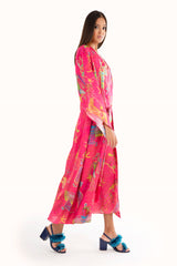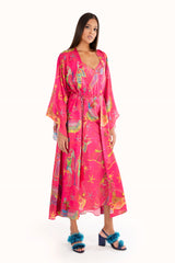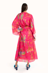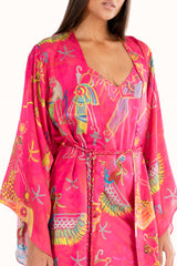 Kimono longo estampado com mangas amplas e assimétricas. Possui abotoamento de pressão e acompanha cinto para amarração.