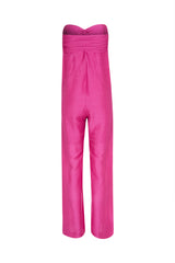 Macacão frente única tomara que caia pantalona. Drapeado no busto. Faixa removível no decote com possibilidade de diferentes amarrações.