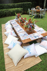 As pinceladas de característica única da designer, saem de suas telas, elaboradas em diversas camadas de tinta acrílica dentro de seu atelier. Essas pinceladas, posteriormente, se transformam em estampas exclusivas e atemporais a cada coleção, mantendo uma estética refinada e o processo de criação artsy na sua mais pura essência.