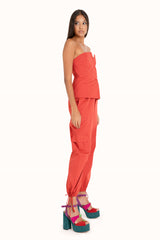 Calça estilo cargo, com modelagem mais ampla, bolsos laterais e amarração para afunilar a barra. Possui corda interna no cós, podendo ser usada com cós alto ou baixo.