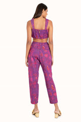 Cropped de alça em sarja estampada e acabamento de vivo. Possui franzido frente e costas, e fechamento com zíper de metal.