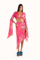Cropped estampado com abertura frontal e amarração. Mangas bem amplas e assimétricas.