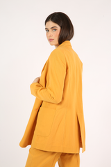 Blazer alongado, bolsos laterais, fechamento por botões frontais, confeccionado em sarja de algodão reciclado de aparas têxteis.