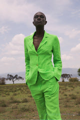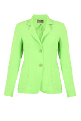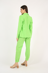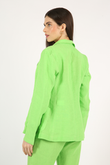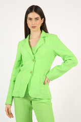 Blazer alongado, ombros estruturados, bolsos frontais, levemente acinturado com fechamento por botões frontais, confeccionado em linho.