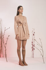 Blusa mullet cropped de manga comprida. Amarração frontal regulável. Com fios metálicos