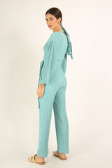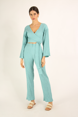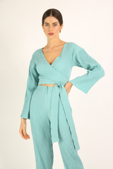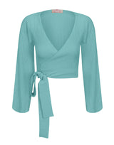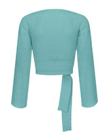 Blusa envelope em tecido anarruga com mangas longas, transpasse frontal formando decote V, ajustável por meio de faixas