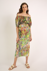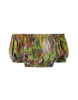 Blusa ombro a ombro confeccionada em seda mista biodegradável estampada comprimento cropped