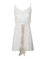 Blusa / Vestido de seda Kika Simonsen com detalhes em metalizado dourado e estampa exclusiva da coleção. Modelagem com amarração na cintura