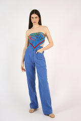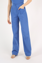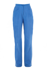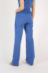 Calça modelagem reta, bolsos frontais, elástico no cós traseiro, confeccionada em sarja de algodão reciclado de aparas têxteis.