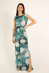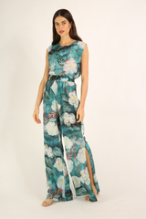 Calça confeccionada em crepe de seda com cós de elástico, modelagem pantalona e fenda nas laterais.