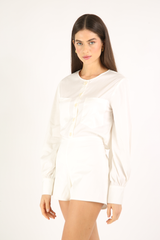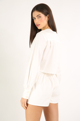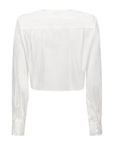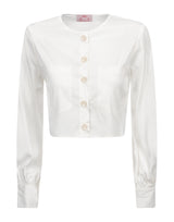 Camisa comprimento cropped, em tricoline de modal com mangas amplas, dois bolsos frontais e fechamento por botões reciclados