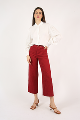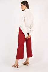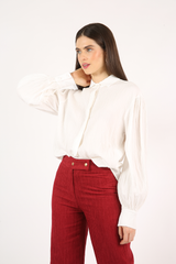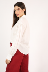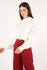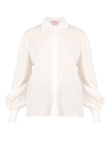 Camisa comprimento alongado, com mangas volumosas, vista embutida, confeccionada em tecido anarruga de modal.