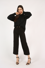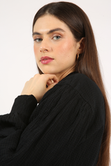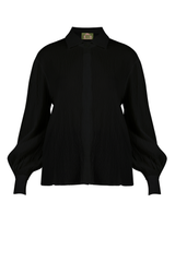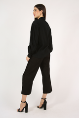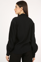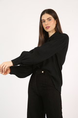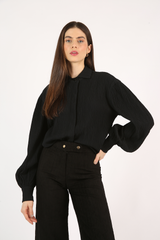 Camisa comprimento alongado, com mangas volumosas, vista embutida, confeccionada em tecido anarruga de modal.