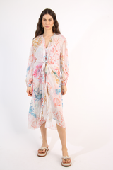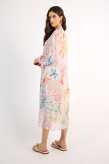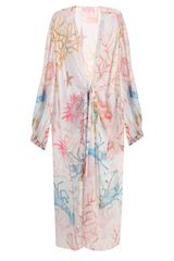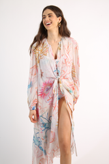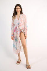 Capa confeccionada em crepe georgete de viscose, mangas longas e volumosas, fechamento frontal por rolotê.