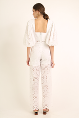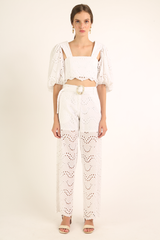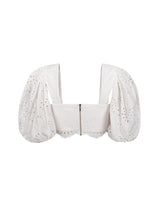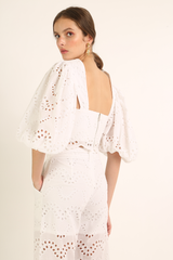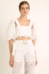 Top cropped em laise bordada com mangas volumosas e detalhes na barra fechamento traseiro com zíper
