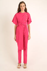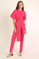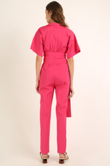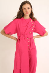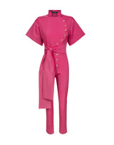 Macacão em tricoline de modal com elastano, mangas volumosas, vista assimétrica e abotoamento frontal. Acompanha faixa.