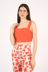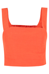 Blusa cropped, com alças largas, detalhe de lastex nas costas para melhor ajuste, confeccionada em linho.