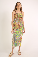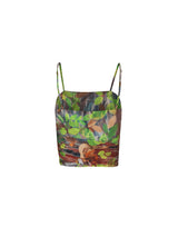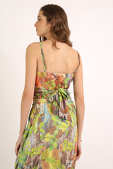 Blusa cropped confeccionada em seda mista biodegradável estampada com alças reguláveis e faixas na barra para amarração