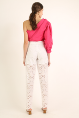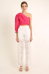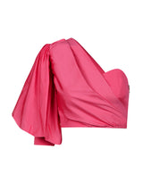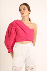 Blusa cropped, em tricoline de modal com elastano, um ombro só, com manga volumosa e fechamento por zíper na lateral