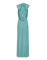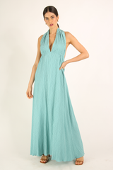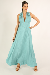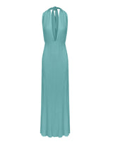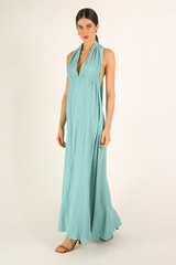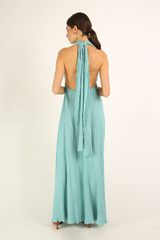 Vestido longo em tecido anarruga, com faixas frontais que permitem diversas amarrações e tipos de decote.