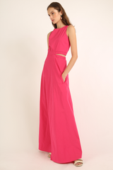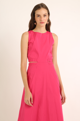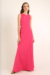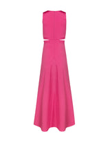 Vestido longo confeccionado em tricoline de modal com elastano, aberturas na cintura e fechamento com zíper nas costas