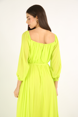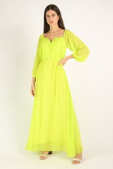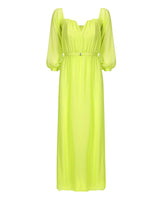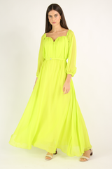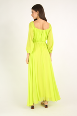 Vestido longo, confeccionado em crepe georgete de viscose, forrado, com mangas longas, acinturado. Acompanha cinto no próprio tecido.