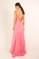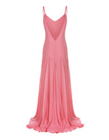 Vestido longo, confeccionado em crepe georgete de viscose forrado, com alças reguláveis e nesgas na barra.