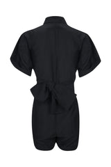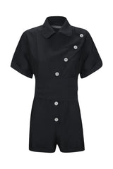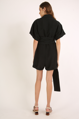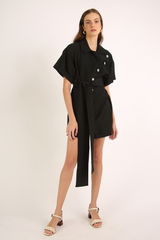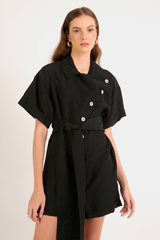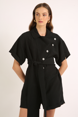 Macaquinho em tecido misto de linho com vista assimétrica e abotoamento frontal. Acompanha faixa do próprio tecido
