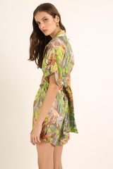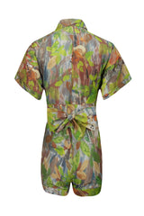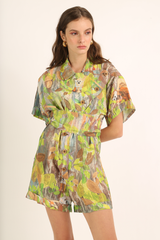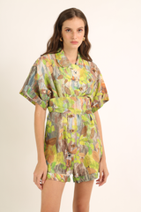 Macaquinho em tecido misto de linho com vista assimétrica e abotoamento frontal. Acompanha faixa do próprio tecido